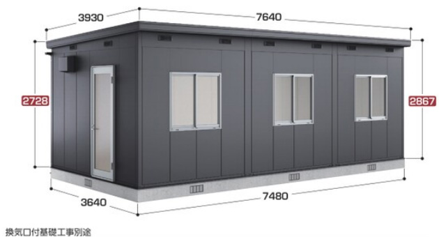 | 標準装備品 | 框ドア、ガラス窓、雨とい、フード付20cm換気扇取付用パネル、フード付給気パネル、エアコン取付支柱、壁・床用断熱材 |